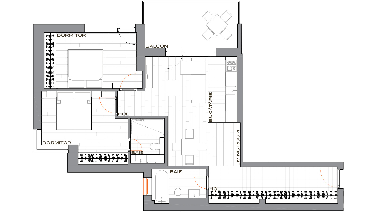 Plăci ceramice mari, rectificate, de calitate superioară în băi și parchet stratificat în zonele de living și dormitoare.